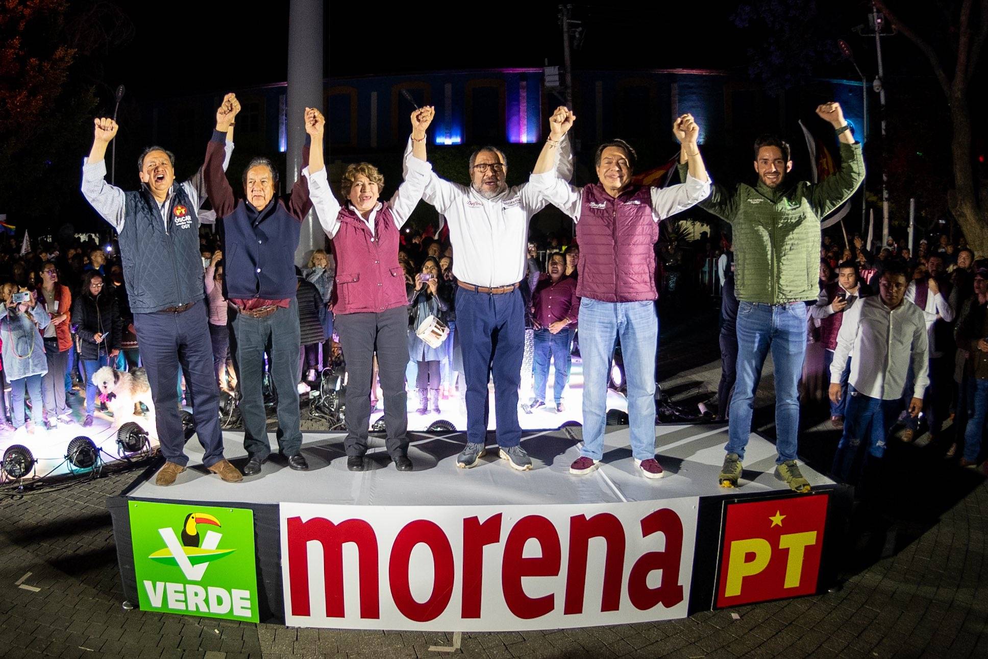 La maestra morenista se reunió con militantes y simpatizantes en el Jardín Municipal de Texcoco, donde estuvo acompañada del dirigente estatal del Partido Verde Ecologista de México (PVEM), José Alberto Couttolenc Buentello, del dirigente nacional de Morena, Mario Delgado; del delegado especial y del coordinador de campaña, Higinio Martínez y Horacio Duarte, respectivamente.